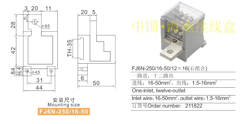 产品分类:FJ6N-250/16-50系列零线端子251