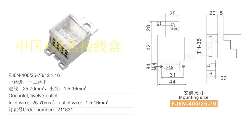 产品分类:FJ6N-400/25-70系列零线端子252