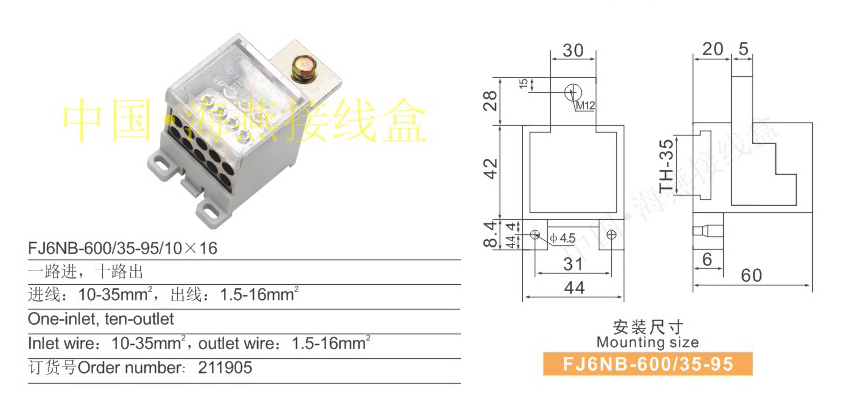 英文名称:independent type neutral line terminal block (connection lug type)