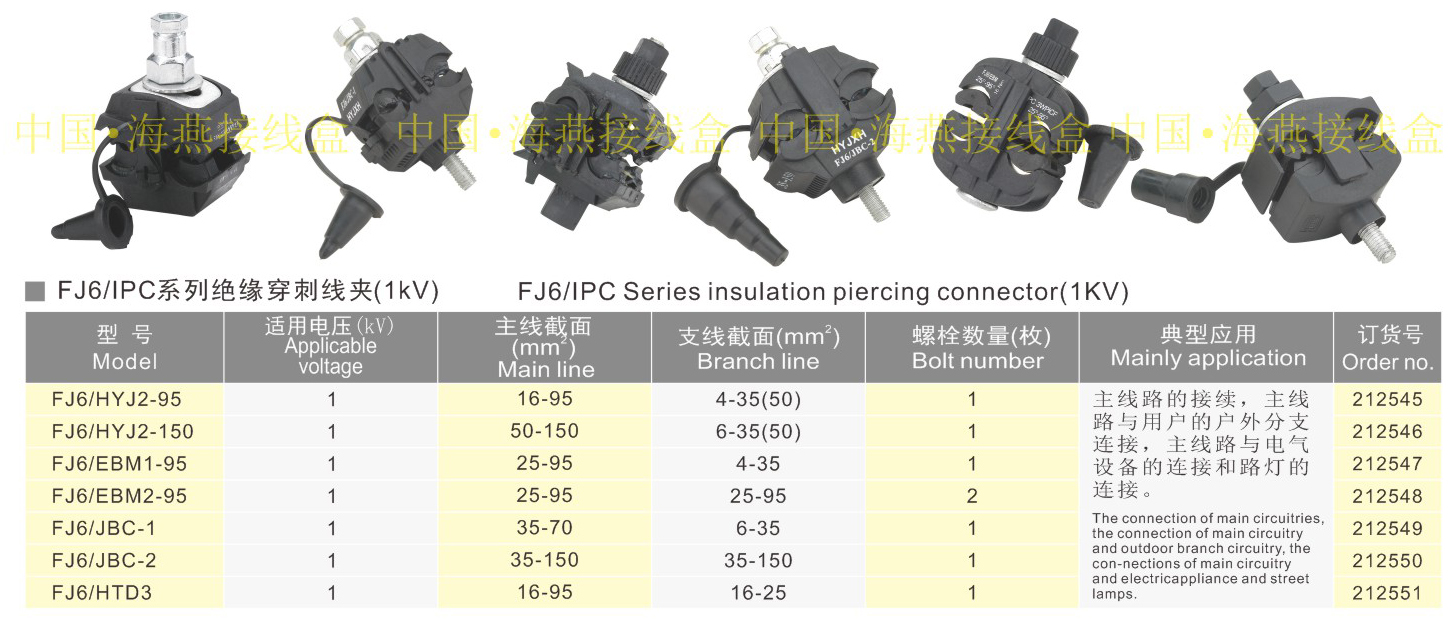 产品分类:FJ6/HYJ、HTD2系列绝缘穿刺线夹1KV387