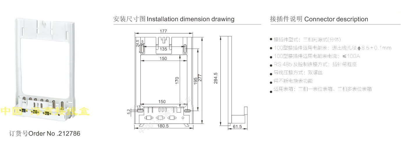 英文名称:Three-phase gap type electric energy meter connector (separate)