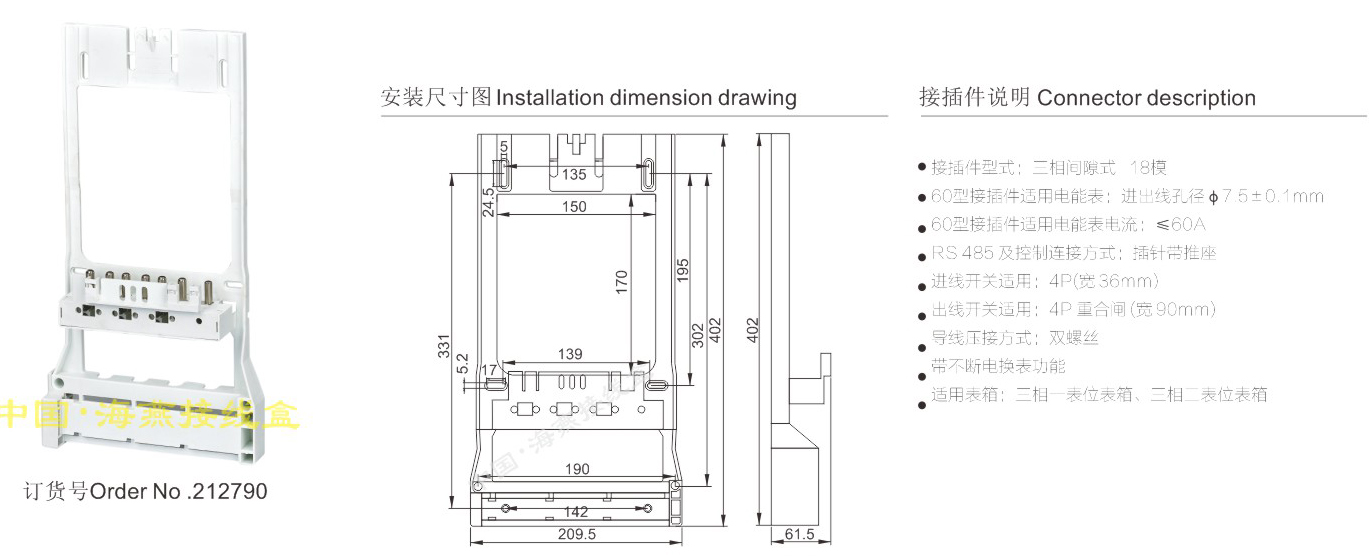 英文名称:Three-phase gap type electric energy meter connector (integrated)