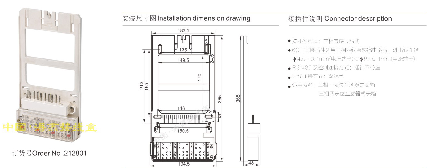 英文名称:Three mutual inductance interference type electric energy meter connector (integrated with joint junction box)