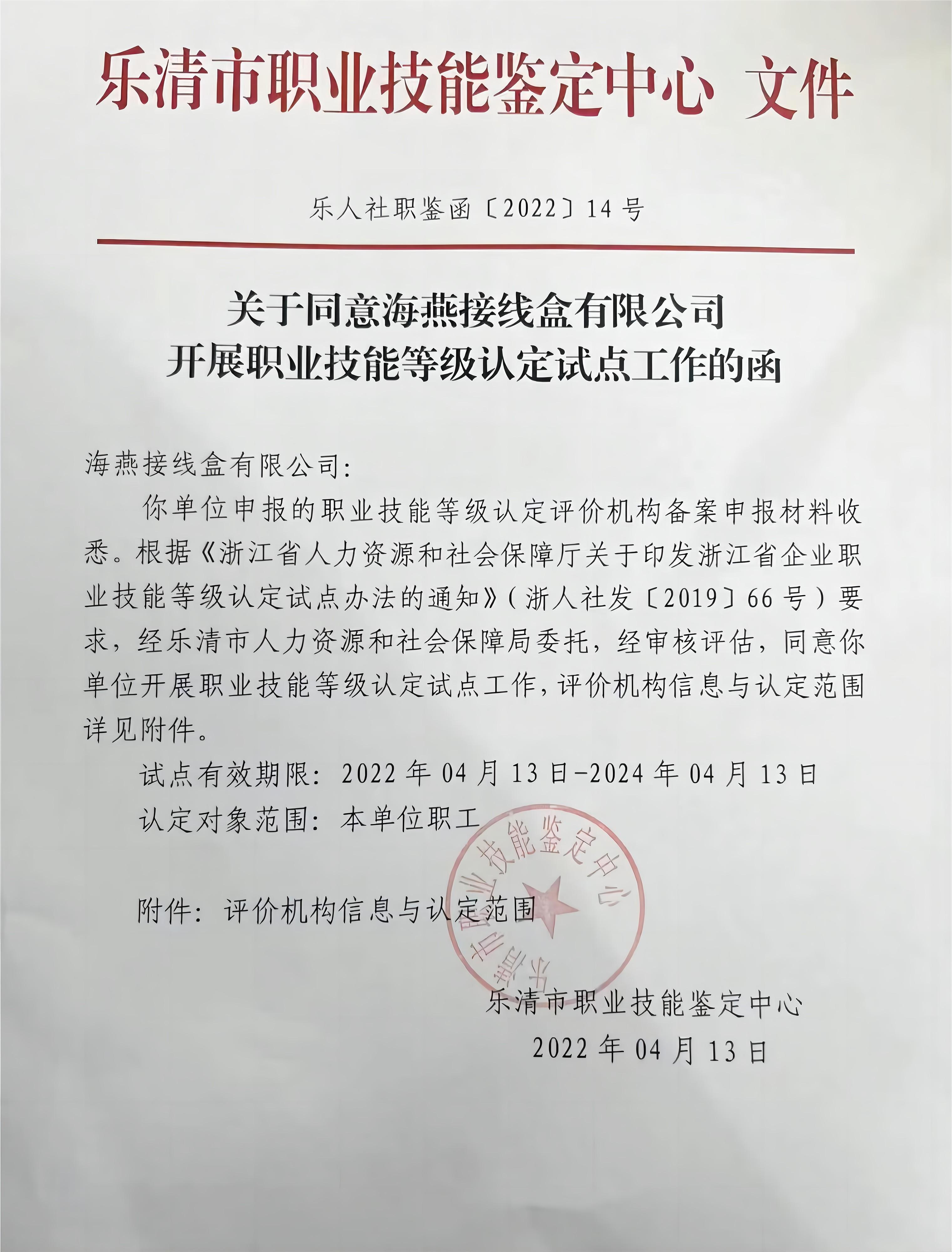 海燕专注接线盒二十多年,在接线盒研发、制造、市场等已获客户认可,随着企业自动化、智能化的深入推进,为提升海燕人的职业化素养,打造高品质产品制造水平,海燕接线盒通过市技能鉴定中心授权获得“温州市首批产教融合站点”,提升海燕员工职业化水平,通过培训、考核、职业化技能认定帮助员工成长,构建职业化团队。