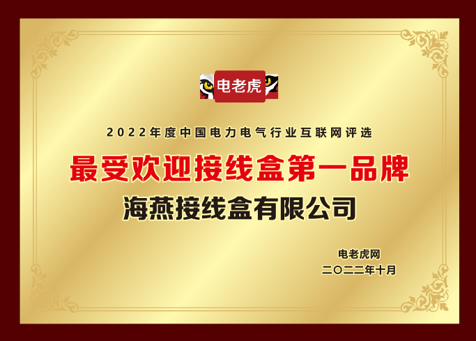 2022年10月12日至10月25日,由江苏电老虎工业互联网股份有限公司发起的行业品牌投票活动,经过十几天的激烈投票,截止10月25日下午5时,在本次“最受欢迎接线十大品牌”投票中,海燕接线盒始终以高票位于行业第一位,得到社会各界人士的普遍认可。荣获“最受欢迎接线盒第一品牌”。