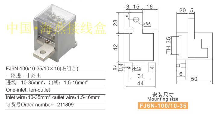英文名称:neutral line terminal block (equipped with circuit breaker on the right)