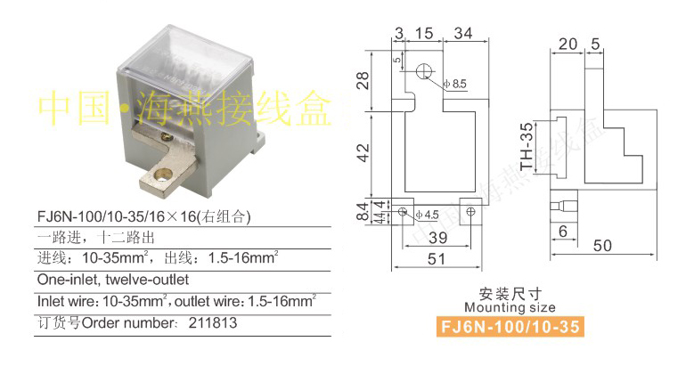 英文名称:neutral line terminal block (equipped with circuit breaker on the right)