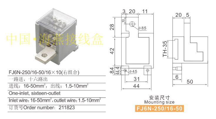 英文名称:neutral line terminal block (equipped with circuit breaker on the right)