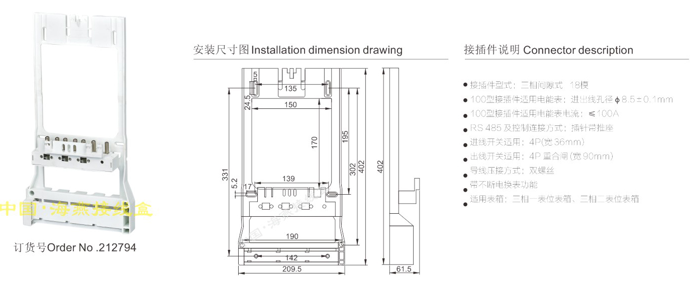 英文名称:Three-phase gap type electric energy meter connector (integrated)
