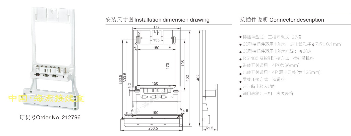 英文名称:Three-phase gap type electric energy meter connector (integrated)