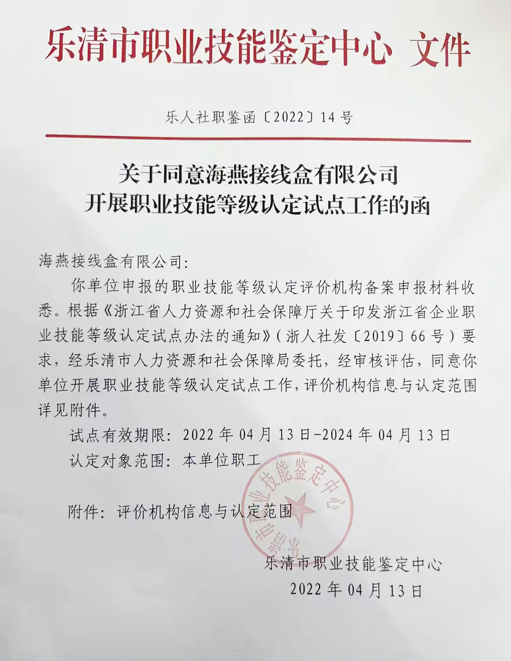 热烈庆祝海燕接线盒有限公司成为职业技能等级认定试点企业